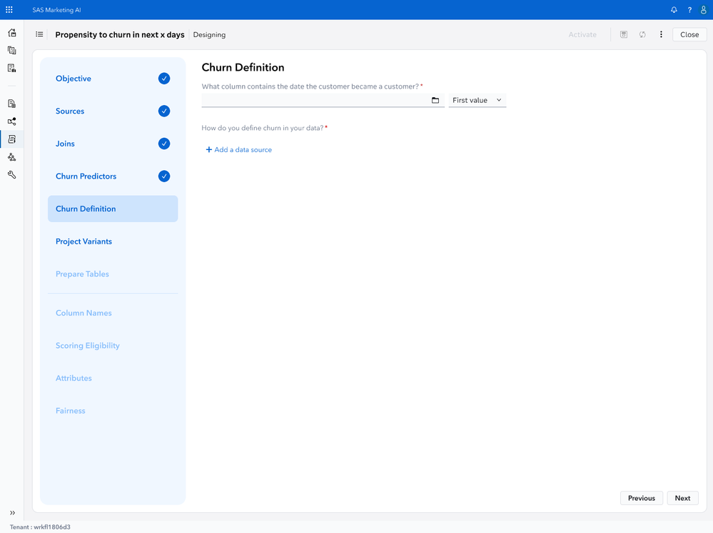 How do use cases and requirement meetings begin? Well, with some type of objective that the brand aligns to. Below readers can view a screenshot of how the software will begin assisting the user through prompted screens to guide a workflow of configuring a recipe focused on customer churn (or retention).