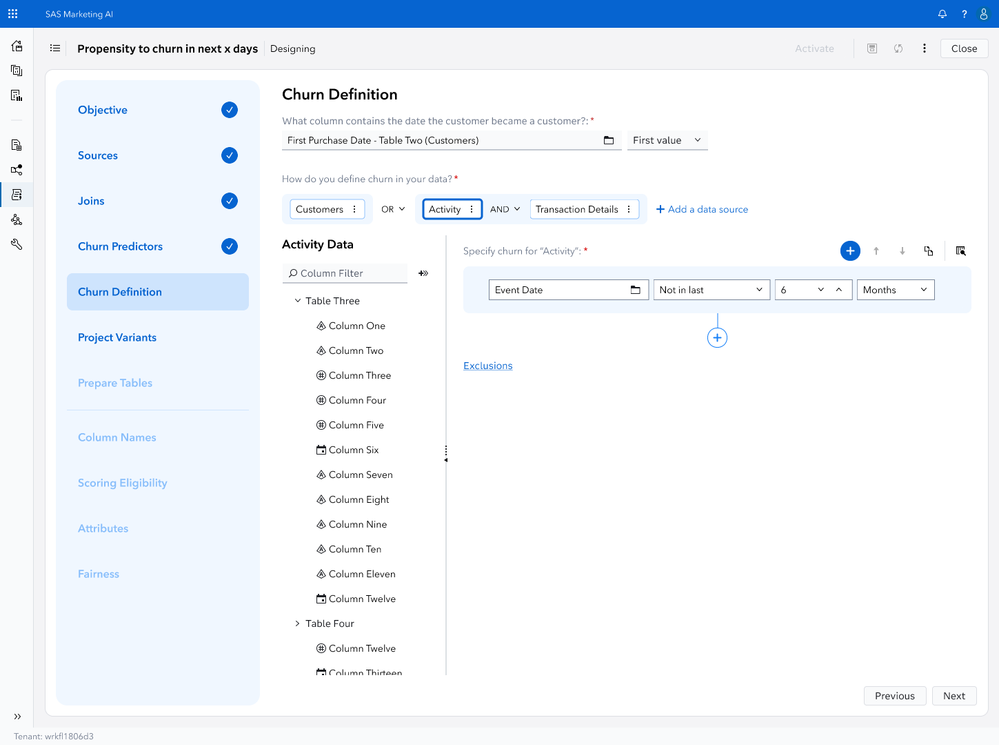 The formation of a model-ready ABT with a customizable target objective leads us to the topic of project variants. Before a brand's data person can share pre-configured recipes with their marketing counterparts, SAS is bringing forth another value proposition in automating the readiness of addressing difficult customer experience scenarios. Take for example, churn. The definition of a churn event of interest can carry different time lines on when to flag (or censor) the customer's exiting behavior. Project variants, as a user feature, will automate the formation of sibling ABTs to enable marketers choice on which time-series scenario is more relevant to their use case.
