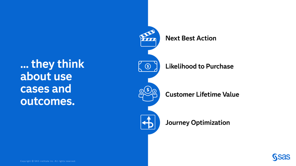 From a software user's perspective, our motivation at SAS is to create an experience that unites what is special and unique about data scientist and marketer talents. To achieve this, use case-driven solutions that proactively and prescriptively guide these two types of anticipated users is the intended vision.