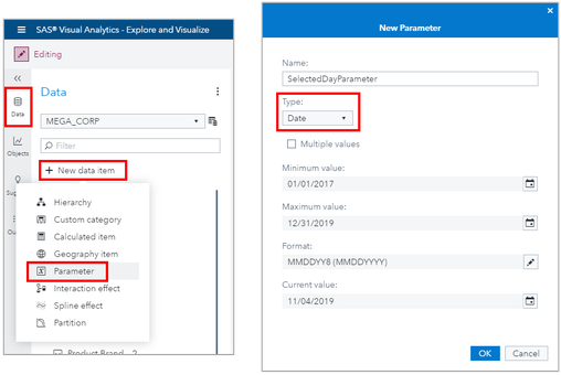 From the Data pane, use the New data item menu and select Parameter. Enter the new parameter information for the date data item and be sure you select the correct Type.