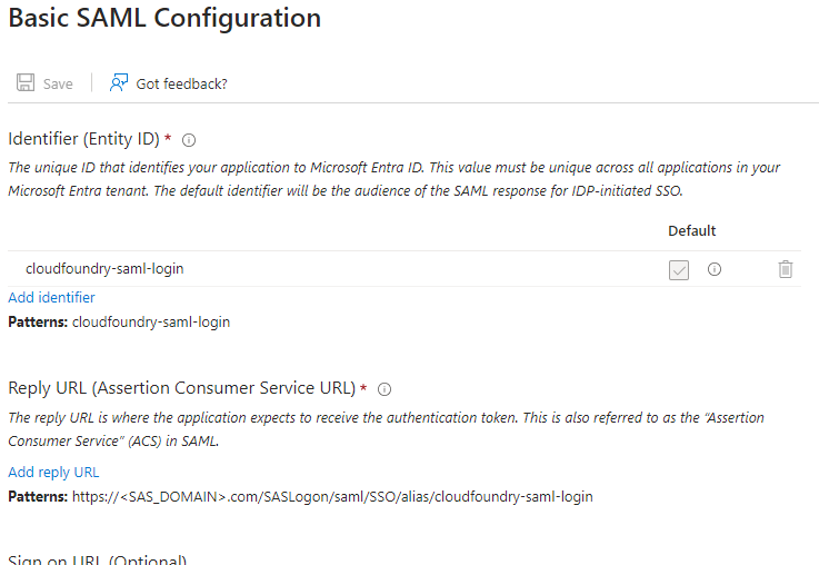 Once the application instance is created. Under the Enterprise Application, select Set up Single Sign-On with SAML to proceed with providing the details of your SAS Viya environment. In the Basic SAML Configuration section shown here: