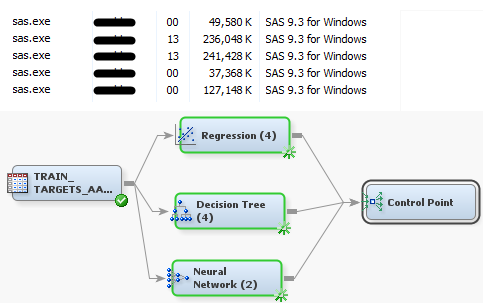 When you create an Enterprise Miner flow, many times you may connect one node to another, in a sequence. When you run this flow, each node runes one after another until completion. You may already know, however, that you can branch your flow and then put a Control Point Node at the end to run multiple flows at once. Let’s look at the sequence of pictures below. I’ve included a portion of my Windows Task Manager for us to examine a well.