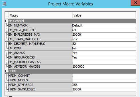In addition, Enterprise Miner HP Nodes allow you to use multi-threaded SAS procedures. Enterprise Miner can automatically set the number of threads, or you can choose to by changing the HPDM_NTHREADS macro variable in the project macro variables.