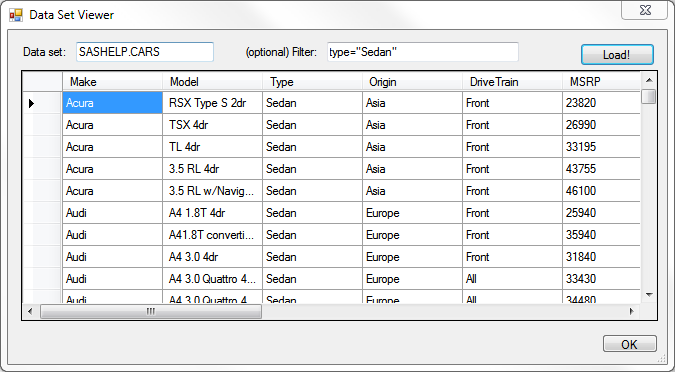 Finally, and not requiring any sort of code at the moment, are there any other ways that SAS data sets could be bound to the DataGridView?  The reason I ask is that I've not found SQL processing to be as quick as accessing data through the IDataService, so maybe there have been some other ways to access data developed since 2009 when I wrote about this in my self-published SAS book.