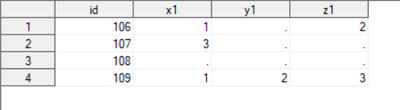 In the 'Have' dataset For example: for 106 subject missing values for x1, y1, z1. then I am expecting to create a variable 'missvar' with variable list separated by delimiter of any kind. is this possible to achieve? Thanks